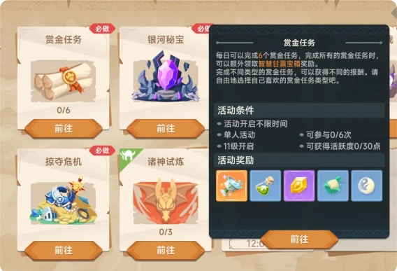 以下是修改后的文本:1. 赏金任务:每天完成六次该任务,就能解锁一次转盘抽奖机会。通过转盘可获取抽卡道具,这是游戏里性价比最高的玩法之一。2. 银河秘宝:此玩法是获取晨星碎屑(用于梦境之旅派遣)的主要途径,同时也能获得经验等奖励。层数越高,挂机收益越丰厚,建议挑战至无法通关的关卡再停止。3. 梦境之旅:玩家需派遣不同定位的宠物执行任务来获取奖励。由于晨星碎屑数量有限,建议优先选择高品质任务进行派遣。