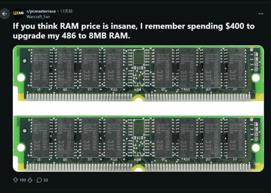 他提到的90年代内存涨价,对应的是90年代个人电脑向家庭用户普及的阶段——特别是微软推出Win95系统后,图形界面的应用对PC配置提出了更高要求,内存需求在短期内急剧增长,这直接引发了1995到1996年间的内存价格大幅飙升,内存条单价从几美元一路涨到了几十甚至上百美元。
