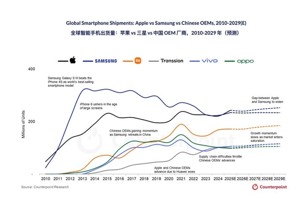 更值得注意的是,10月苹果在中国智能手机市场份额达到25%,创近三年新高,每售出4部手机就有1部是iPhone。在全球范围内,苹果更是有望在2025年全年出货2.43亿部,超越三星,时隔14年重登全球第一宝座。