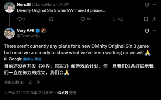 当有玩家直接询问“《神界:原罪3》何时推出”时,Douse明确回应:目前团队暂无开发《神界:原罪3》的计划。但他同时也未排除《神界》系列未来仍有新动作的可能性。