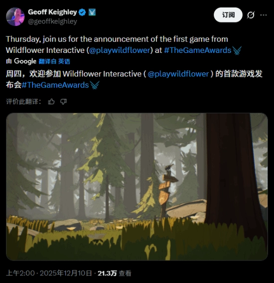 TGA主持人Geoff Keighley已确认,Wildflower Interactive的首部作品将在本届颁奖典礼上正式公布。同时发布的一段时长约30秒的预告,呈现出游戏的卡通渲染美术风格与一片景致优美的荒野场景,背景里还能听到若干对话,其中包含类似熊的吼叫声以及带有安抚意味的台词。