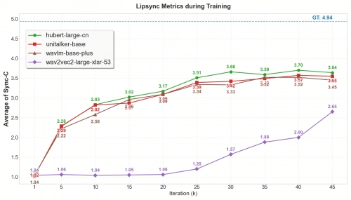 在2D数字人生成领域,部分工作仍采用早期wav2vec2系列预训练语音编码器来实现角色驱动。商汤团队依托在3D数字人语音驱动技术(UniTalker)研发过程中积累的算法经验,察觉到语音编码器的选型对数字人驱动效果起着关键作用。基于这一发现,研究团队针对wav2vec2、hubert、wavlm、whisper等多款主流语音编码器,开展了2D数字人驱动场景下的性能对比研究。结果显示,即便是多语言预训练的wav2vec2-large-xlsr-53模型,在英语口型驱动精度与多语言泛化能力的定量评估中,表现也不及其他几款编码器。通过系统的消融实验验证后,SekoTalk最终选用了此次研究中性能最优的音频编码器;结合大规模数据训练优化,该系统在中英文、多类小语种场景,以及日常对话、说唱等多样化语音输入下,均实现了精准的数字人驱动效果。