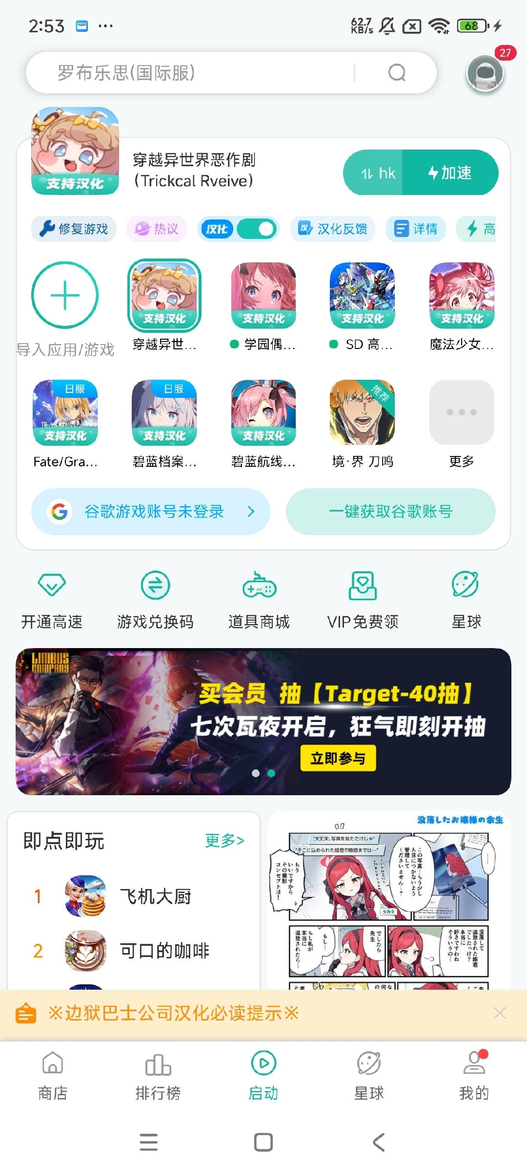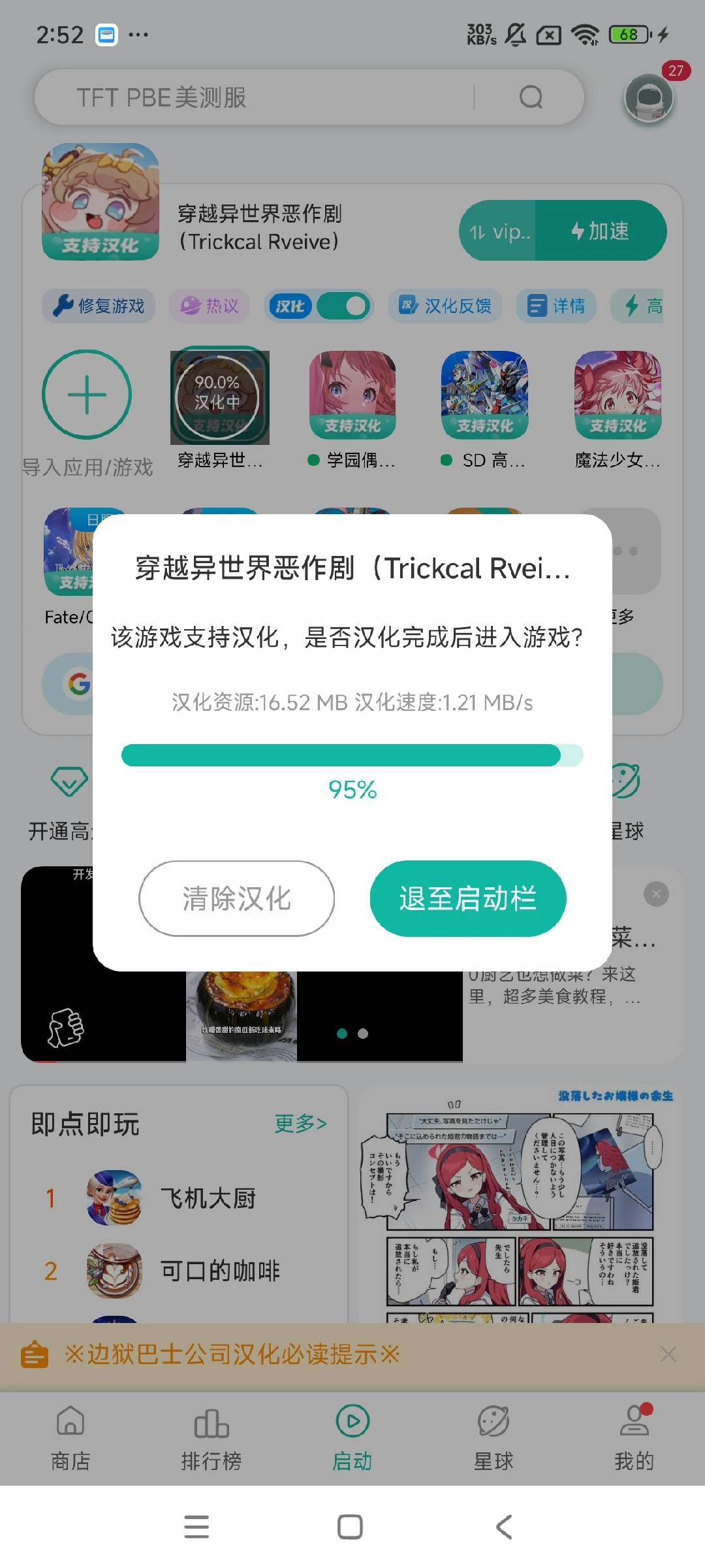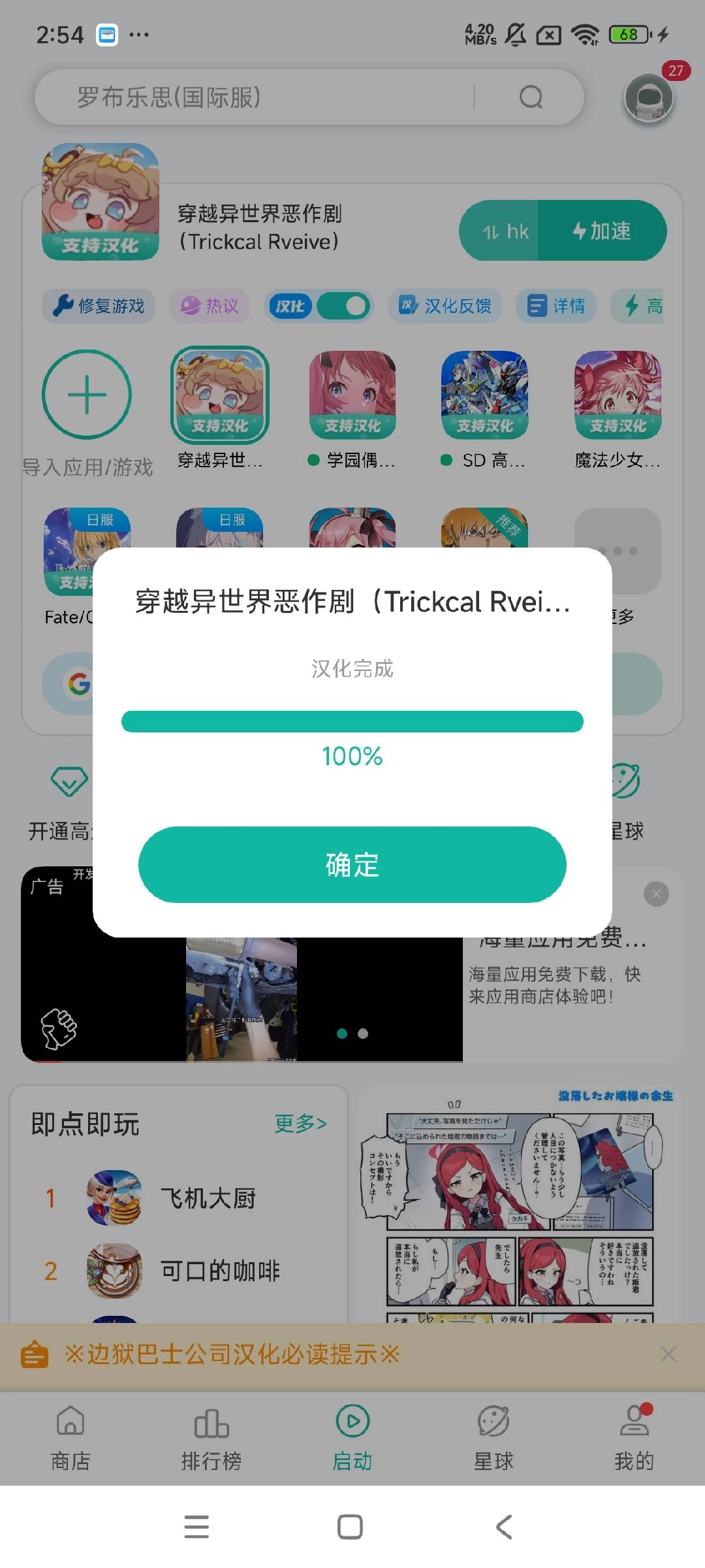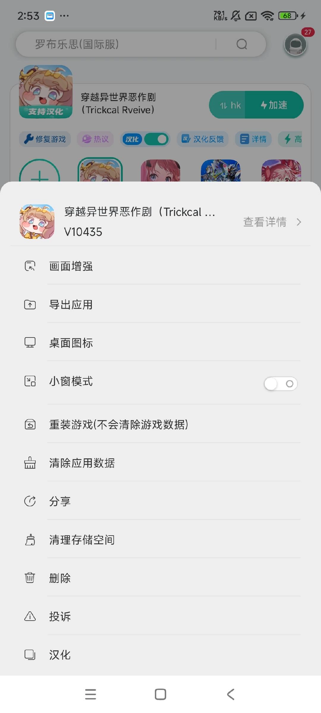 下载完成后,《穿越异世界恶作剧Trickcal Rveive》的图标上会显示“支持汉化”的标识。此时,长按“导入应用”旁的该游戏小图标按钮,就会弹出游戏辅助设置的弹框,在弹框底部找到“汉化”按钮并点击即可。