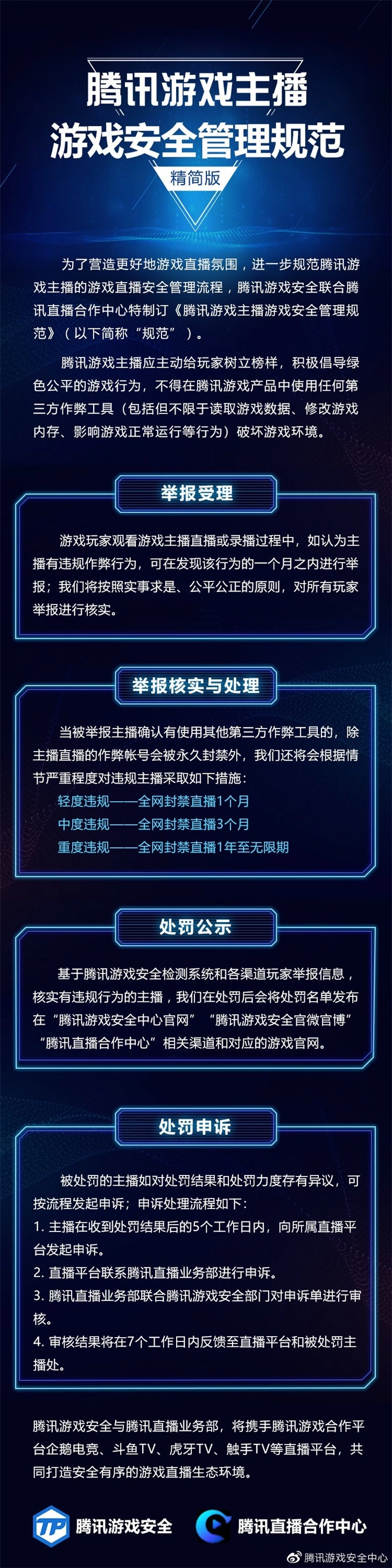 为了打造更优质的游戏直播环境,进一步完善腾讯游戏主播管理工作流程,腾讯游戏安全与腾讯直播合作中心共同制定了《腾讯游戏主播游戏安全管理规范》(以下简称“规范”)。
