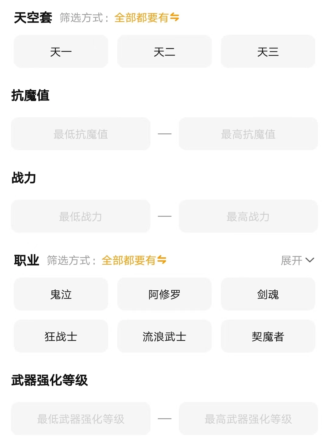 游戏里最关键的环节是完成各种任务和参与竞技场,在竞技场玩法中不仅能获取赛季排名,还能得到丰厚的道具资源。只有拥有足够的材料,才能给角色的武器套装进行升级。不少玩家选择直接购买账号,也是为了跳过游戏的前期阶段,并且在买号时可以多方对比,想要什么样的武器装备,就能在交易猫上对游戏账号的装备内容进行筛选,这样搜索出来的账号就都符合玩家的要求了。