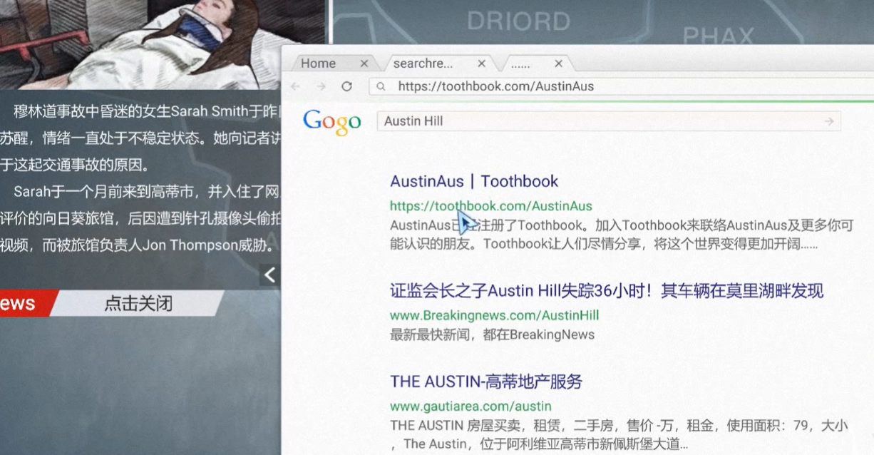 经过这一系列操作,我们会定位到一所中学。接着,我们需要分别点击学校官网里的四个目录,并按照不同类别把相关信息整理妥当。之后,再用同样的方法去数据库中的社交账号密码,找到其中两封邮件。这是目前为止唯一一次没有通过逻辑推理就直接给当事人打电话的情节。