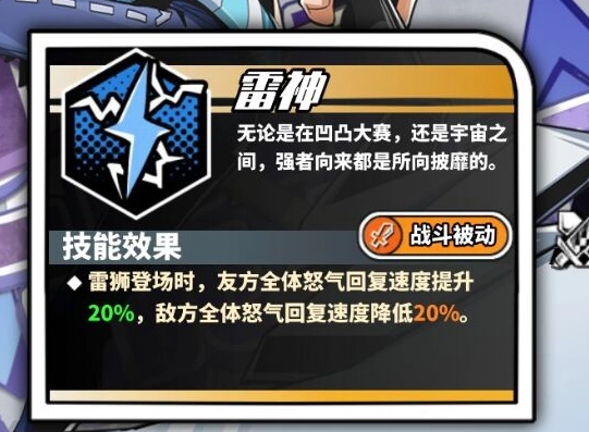 他不仅能对敌人造成大范围伤害,在触发战斗被动技能“雷神”时,还能让己方全体队友的回复速度提升20%,同时降低敌方全体的怒气回复速度。不过他的上阵能量要求是19,因此小编建议在他登场前先安排一个上阵能量需求较低的角色,这样组合使用的效果会更佳。