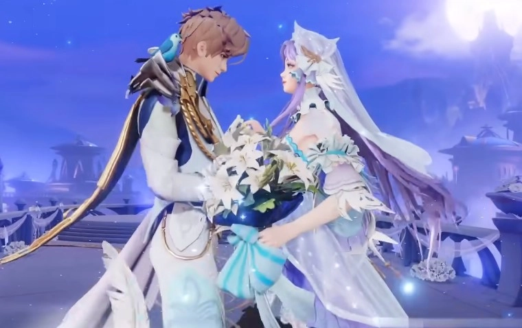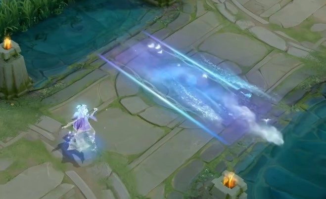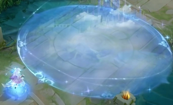 二技能:在地面召唤出一个特殊站台,站台上方会缓缓浮现出冰蓝色的头纱,将站台上的角色笼罩其中后再悄然隐去。