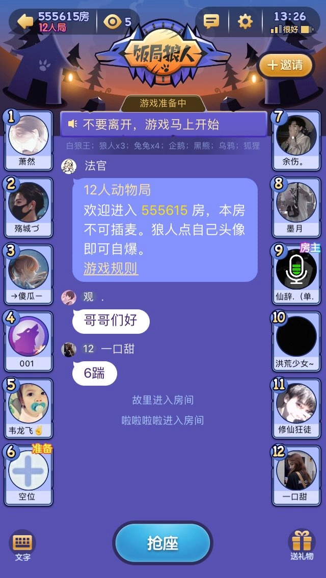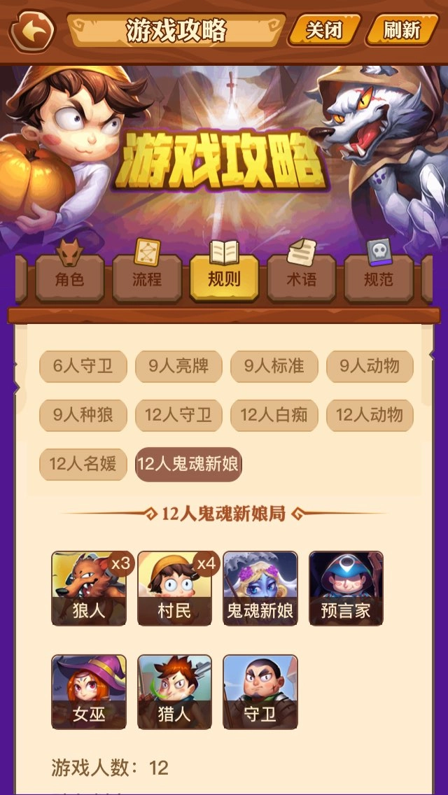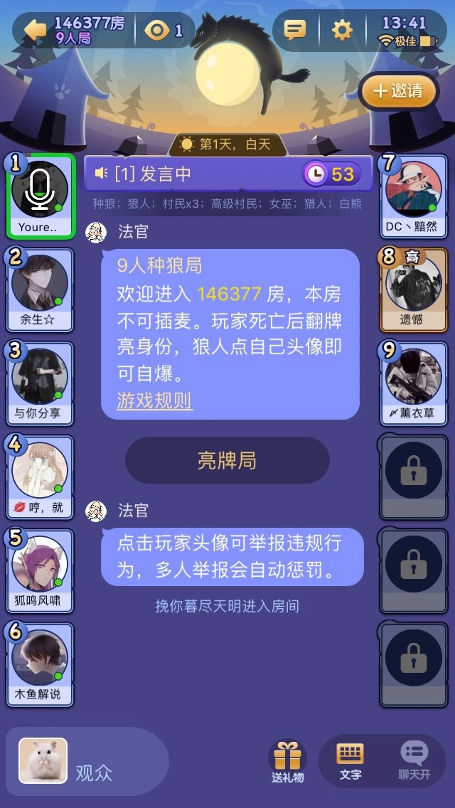 游戏配置如下:3个狼人、4个村民、1个鬼魂新娘、1个预言家、1个女巫、1个猎人、1个守卫。