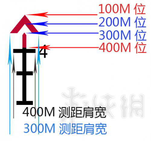 很多玩家可能会问,怎么才能判断目标的距离呢?其实四倍镜是测距的好帮手,它的刻度设计就是专门用来测距的。当目标在100米远时,人物的肩宽和四倍镜最上方的红色尖端宽度一致;200米时,肩宽和红尖的中部宽度相等;300米时,肩宽刚好对应第一个红色刻度线的宽度;到了400米,刻度右侧标有数字“4”的那条线,和目标肩宽是等宽的。这是在不调整归零距离情况下的测距和射击技巧,原理是通过抬高枪口来修正子弹的抛物线弹道。由于倍镜是等比例放大的,大家只要根据视野里敌人的身体宽度来提前瞄准就可以了。