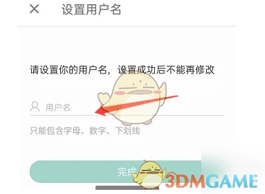 5、进入用户名设置界面,输入个人新昵称,点击“完成”按钮即可。