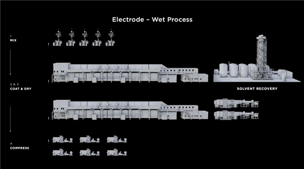 因此,马斯克就从他的第一性原理出发,本来电池材料就是干的,混合了液体材料后还要再烘干,那为啥不干脆直接用干的材料混合呢?