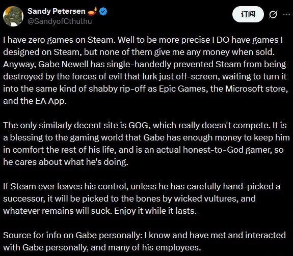 近日,曾参与《毁灭战士》《雷神之锤》设计的Sandy Petersen发布推文,对Steam创始人Gabe Newell表示强烈支持,并称赞对方“几乎是以一己之力守护了Steam”。