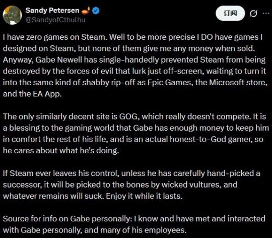 近日,曾参与《毁灭战士》《雷神之锤》设计工作的Sandy Petersen发布推文,对Steam创始人Gabe Newell表达了强烈的支持态度,还称赞对方“几乎是以一己之力守护着Steam”。