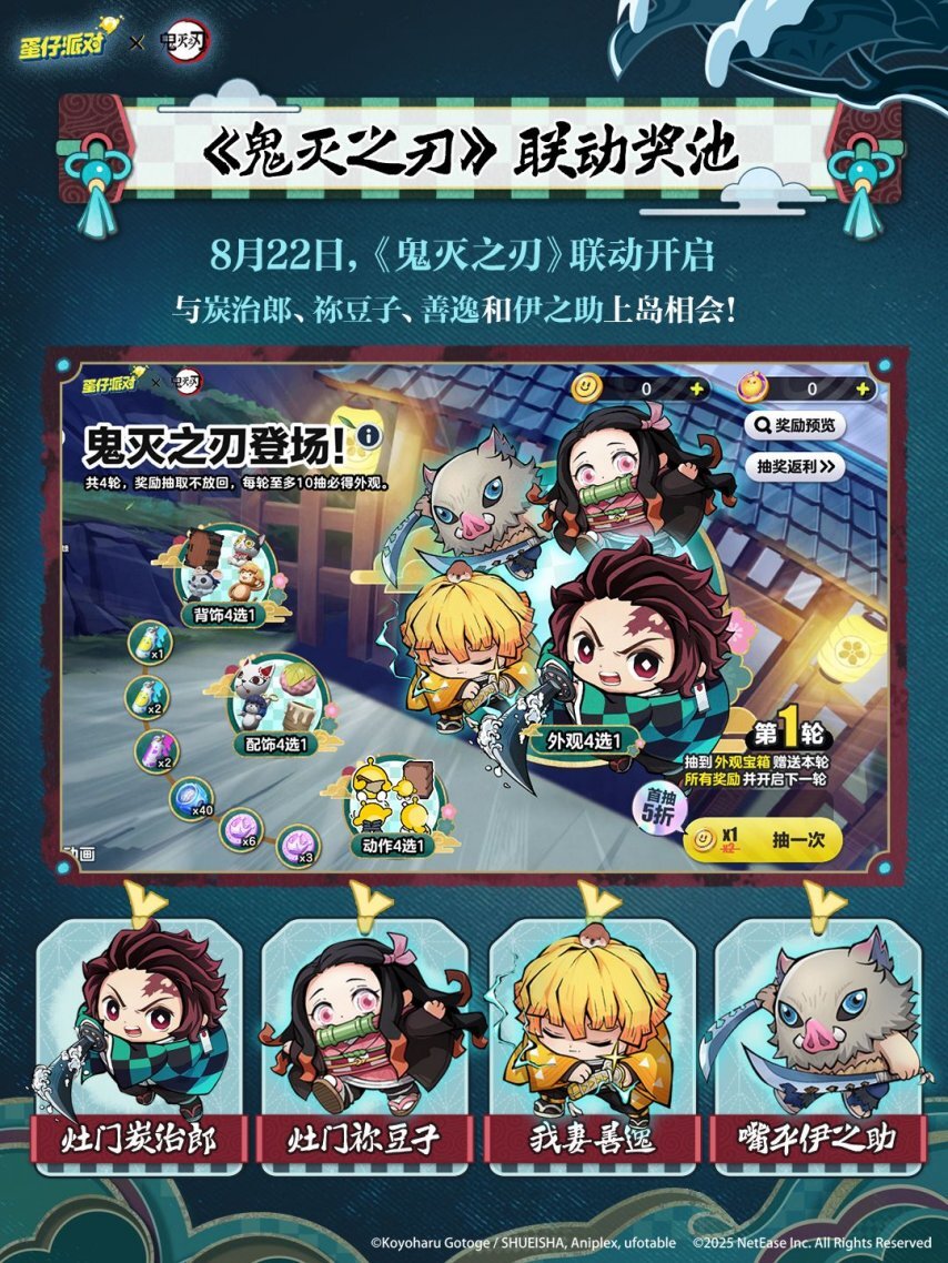 国民原创乐园游戏《蛋仔派对》与《鬼灭之刃》的惊喜联动已于8月22日正式开启!当那些充满热血与羁绊的伙伴们打破次元壁,从漫画书页中跃入热闹非凡的派对关卡,这场期待已久的跨次元邂逅,正等待着每一位玩家前来赴约!
