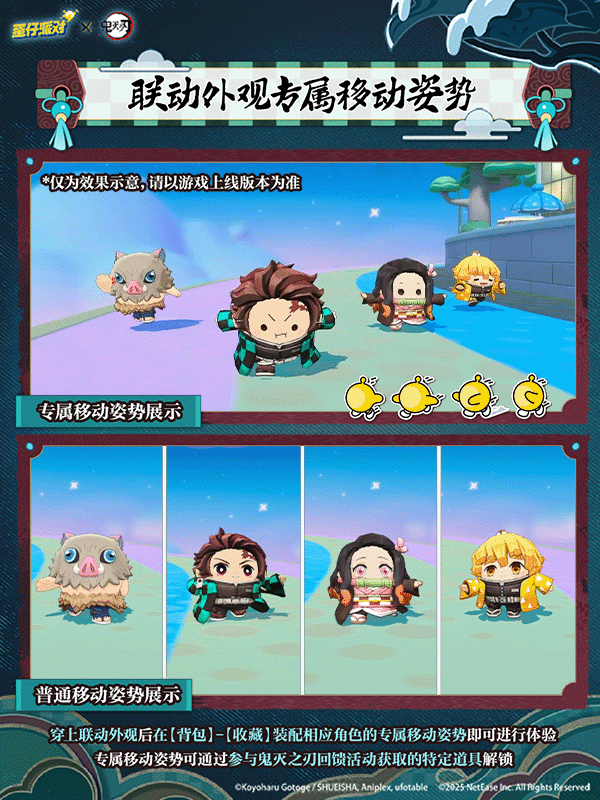 4款联动外观提供中、日双语配音,且支持自由切换。采用版权原声的日语配音,开口便能唤起熟悉的感觉,让角色的经典语音在蛋仔岛再度响起!