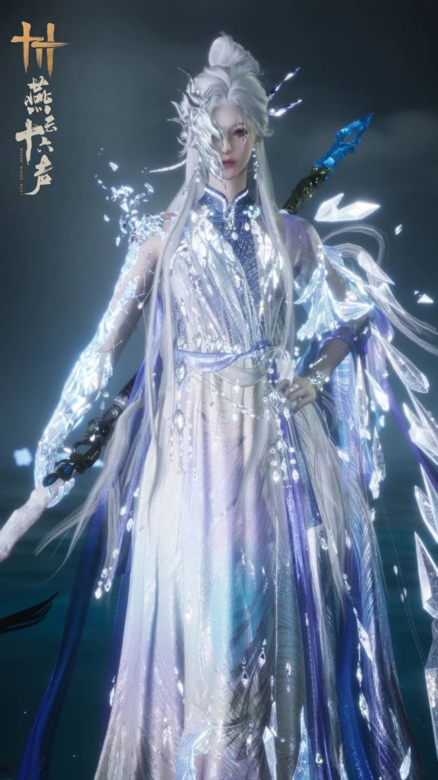 这件衣裳的设计灵感,源于破除虚妄、在涅槃中淬炼出的求真意志。整体以清冷的广寒白为主调,与澄澈的冰魄蓝交相辉映,衣身仿佛披覆着璀璨星河,隐隐透出冰川崩裂般的磅礴威势。