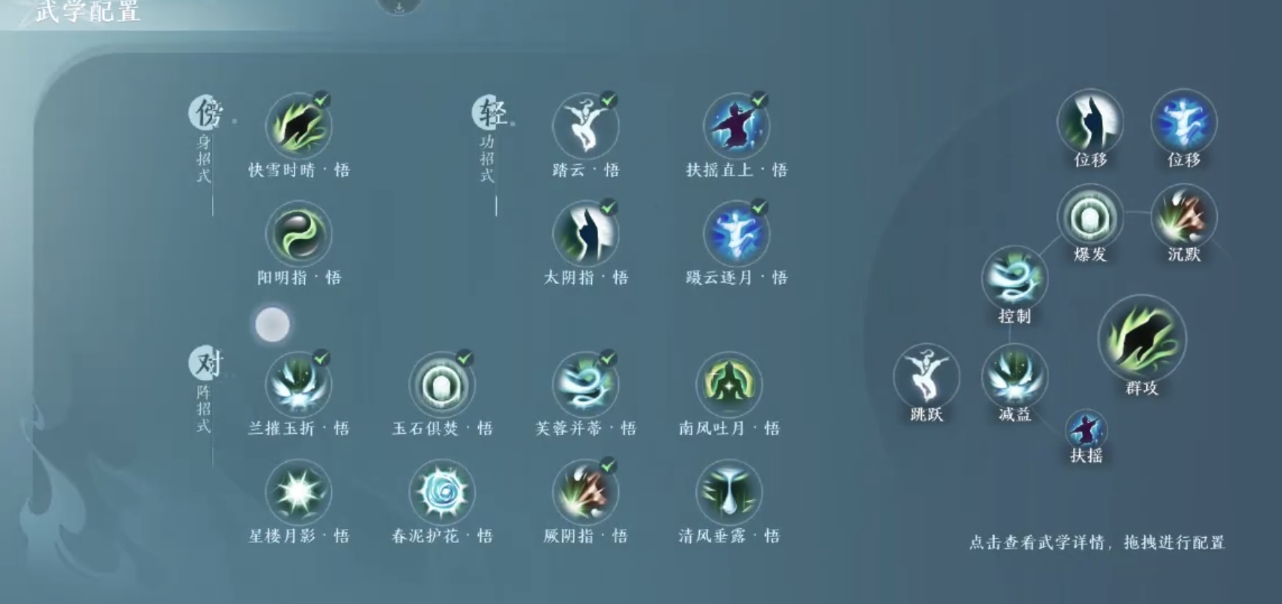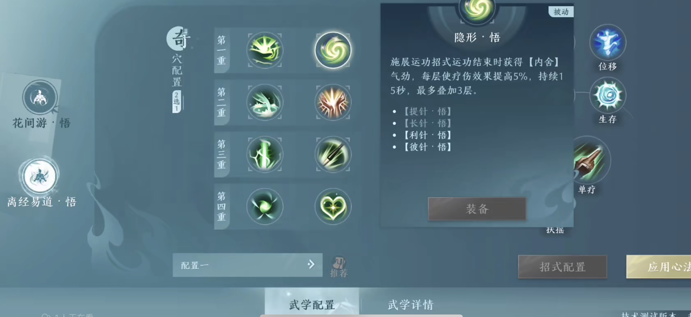 接下来要介绍的是万花的技能体系。万花的核心技能包括太阴指、清风垂露、毫针、星楼月影和春泥护花这几个。其中太阴指的作用在于提升移动速度,当玩家遭遇敌方压制或即将被控时,可借助太阴指拉开与对手的距离,提前做好防御准备;清风垂露则是专门的解控技能,一旦被敌人控制,使用它就能解除控制状态,避免陷入被动局面;春泥护花不仅能为队友提供增益效果,还可以增强自身的免疫能力。