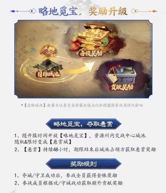 已确定会在资源州内的交战中心城池刷新悬赏城,持续时长为两天,悬赏的金铢数量以及位置,会受到当前霸业值占比与同盟国家战局状况的影响。