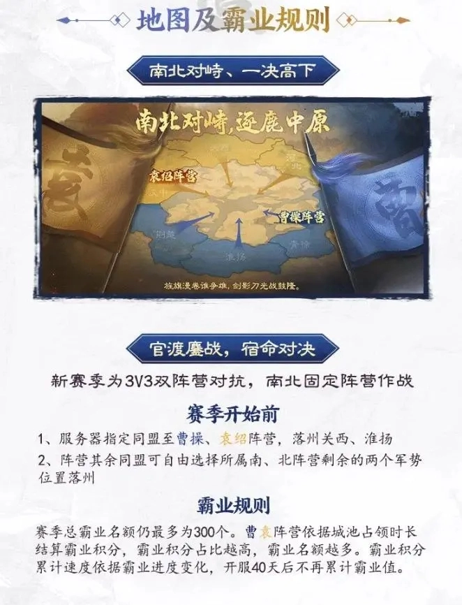 《三国志·战棋版》PK5官渡之战赛季,依旧沿用3V3玩法,此次是南北对战。赛季开启前,服务器会指定同盟加入曹操或袁绍阵营,并分别在关西、淮扬落州。而阵营中的其他同盟,则能自由挑选南、北阵营剩余的两个军势位置进行落州,其余规则基本相似。