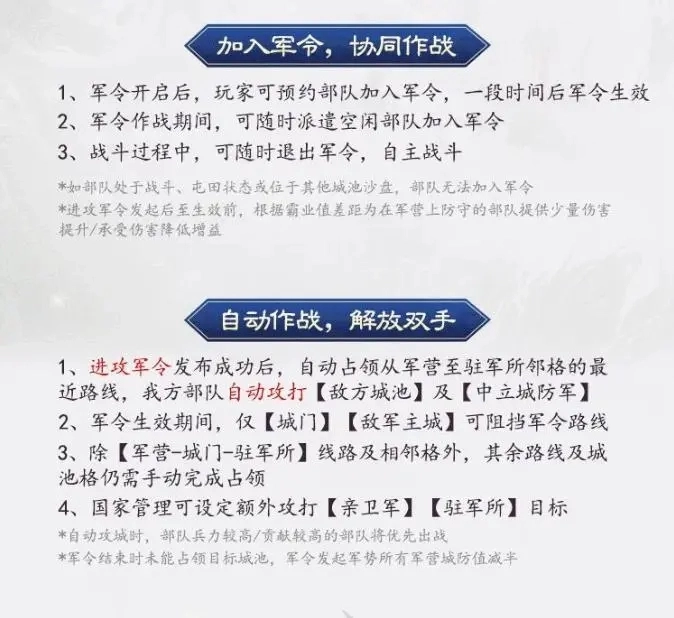 军令发起后,负责在军营防守的部队会获得少量增益。然而,若军令结束时未能成功占领目标城池,所有军营的城防值将减半,同时存在惩罚系统。