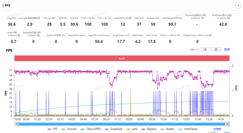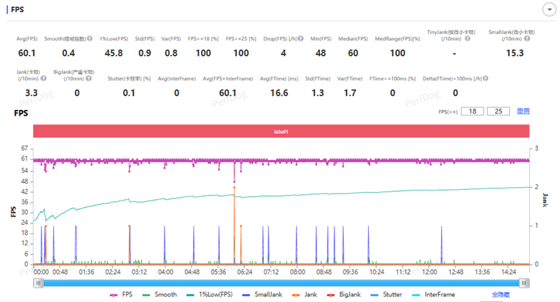 原神最高画质60帧,大地图跑图15分钟,平均帧数60.1FPS,稳帧指数0.4,1%low帧45.8FPS。
