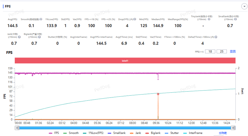 在一场5v5天梯模式的回放对局里,游戏平均帧率达到了144.5FPS,稳帧指数为0.1,即便是代表极端低帧情况的1%low帧也有133.9FPS,这一表现甚至超过了其他120帧规格机型的平均帧率水平。