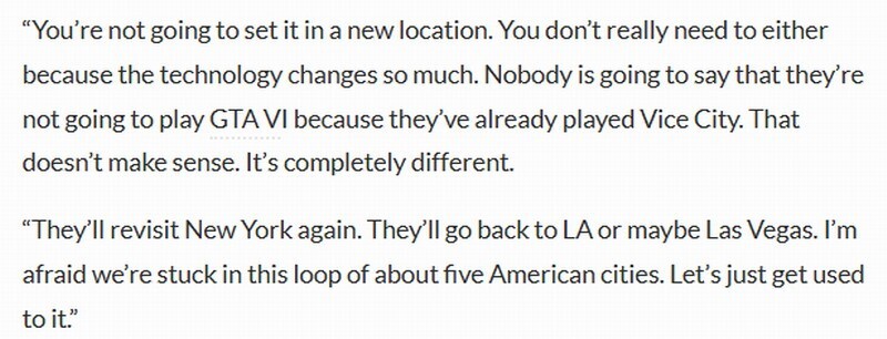 弗梅伊觉得,制作《GTA》这类体量巨大的游戏所需的开发周期正变得越来越长,而且该系列又和带有“讽刺意味”的美国城市文化深度绑定,这些因素都表明,这个游戏系列在未来大概不太会再去探索全球范围内的其他城市了。