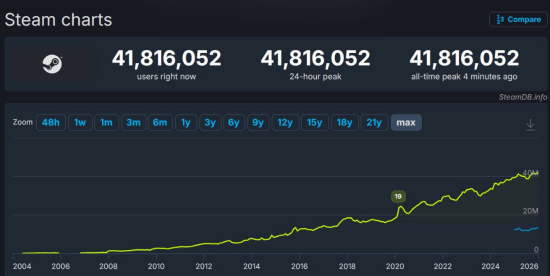 根据SteamDB网站的数据显示,Steam平台的同时在线人数现已突破4180万人,达成了全新里程碑!