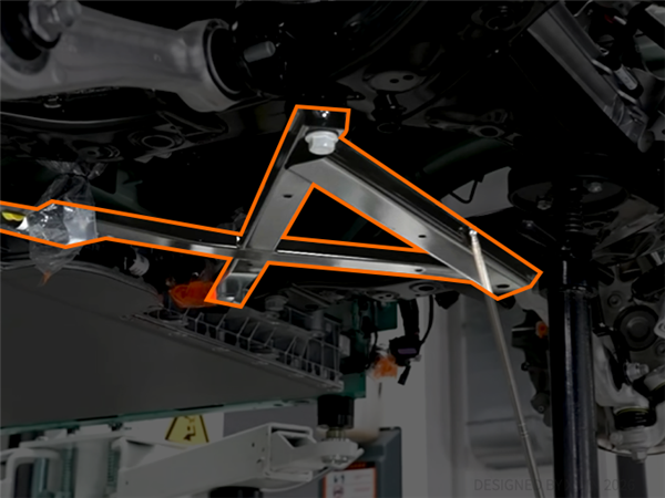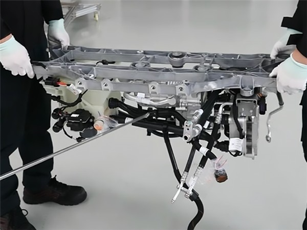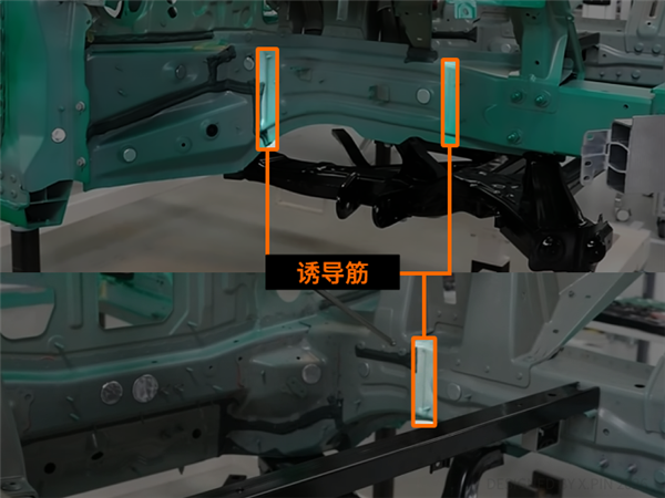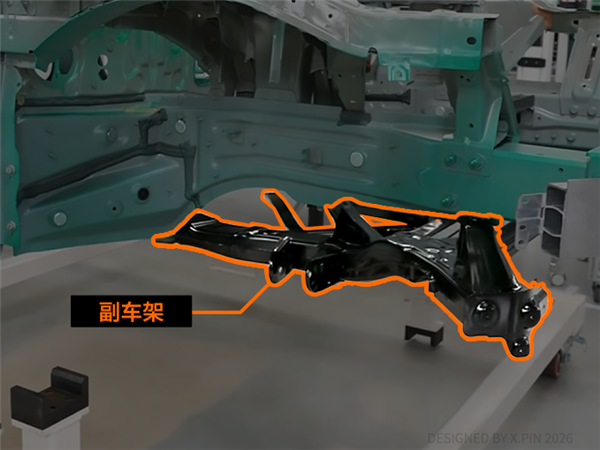 强哥他们把下面黑色的副车架做成像 “牛角” 状的向外分叉,在偏置碰撞中既能代替一部分纵梁的作用,又能把力卸向一边。