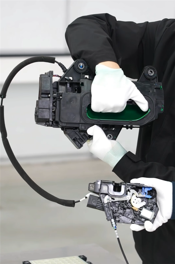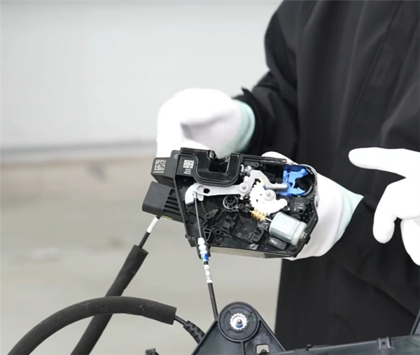 这是小米 YU7 的门锁结构,有机械解锁拉线