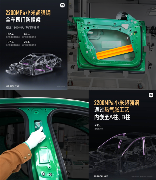 在“硬”实力层面,YU7的A、B柱内部以及四门防撞梁均采用内嵌热气胀管的结构设计,所使用的材料是与王国栋院士团队、育材堂联合研发的2200MPa超强钢。