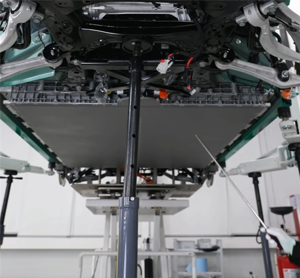 副车架与电池中间,有着一个 “交叉” 形状的压铸横梁,它的高度比电池包低,能替电池包先抵御一波异物冲击。