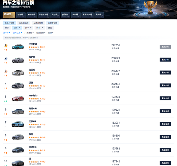 根据小米汽车刚刚发布的数据,小米 SU7 是过去 12 个月 20 万以上轿车累计销量排名第一。