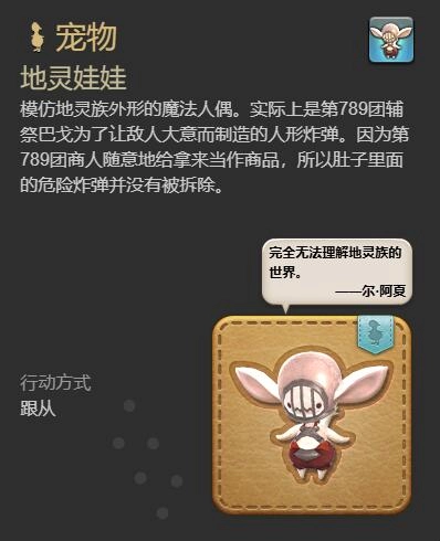在《最终幻想14》里,存在着众多宠物。不少玩家都好奇地灵娃娃该如何获取。其实,玩家只需花费25000金币,在【地灵杂用商人】那里购买,就能得到地灵娃娃。下面,就由小编为大家详细介绍《最终幻想14:水晶世界》地灵娃娃的获取方法,希望这篇文章能对大家有所帮助!