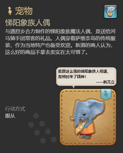 《最终幻想14》里的悌阳象族人偶是一只超可爱的小象,有些玩家不清楚它的获取方式。其实,在萨维奈岛X:20.4 , Y:28.4的位置,找甘妲用8个星钴币就能兑换得到。要是你喜欢这只小象,那就可以把它“领”回家啦。下面,就由小编为大家介绍《最终幻想14:水晶世界》中悌阳象族人偶的获得方法!