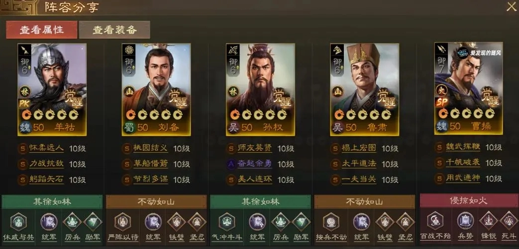 在四保一的阵容体系中,羊祜负责保障SP曹操安稳度过前期阶段,鲁肃则凭借自身能力迅速助力SP曹操叠加层数。到了后期,拥有高增伤与高属性的SP曹操,能够在战场上势如破竹。倘若不想采用四保一阵容,那么可以安排孙权携带浸微浸灭和裸衣血战这两个技能,以此来补充伤害并实现偷袭效果。