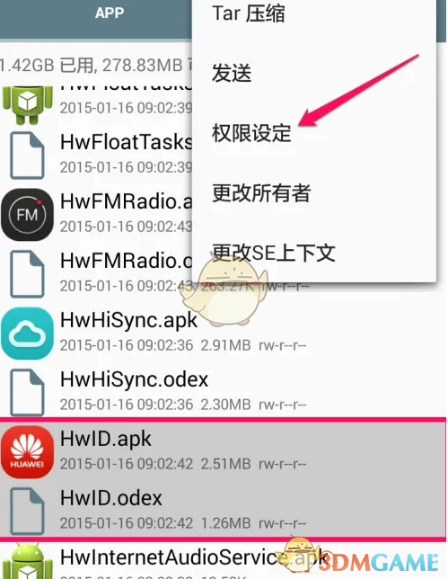6、在选中想要删除自带软件的两个文件后,点击右上角的选项,接着选择权限设定功能。