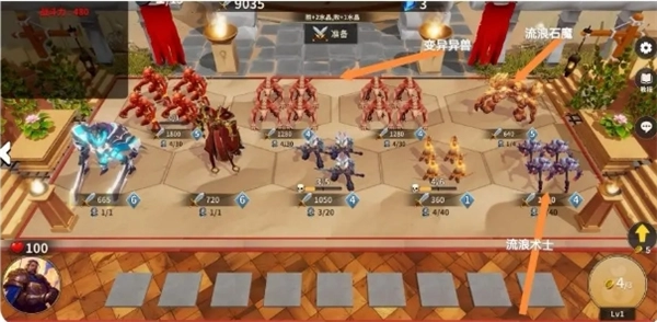 阵容包含:变异血魔(也可用恶魔先锋替换)、两个变异异兽、流浪石魔、死亡骑士、大巫妖、恶魔勇士、流浪射手以及流浪术士。