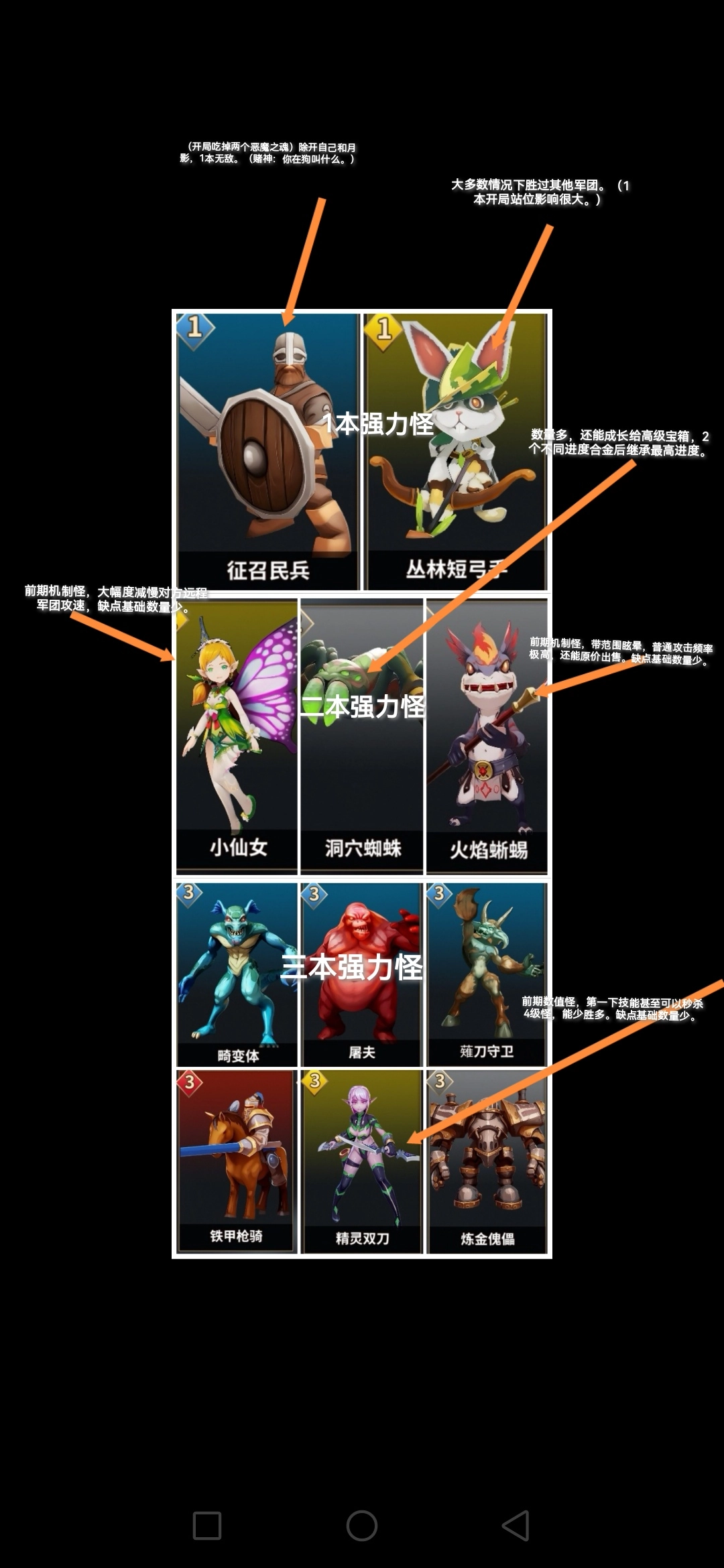 细节:这款游戏本并未明确指出兵种类型,所有都统称“军团”。然而,玩家们自行进行了区分:具备冲锋能力的被视作骑兵,能够远程攻击的归为射手,平稳向前推进的当作战士,数量上限极低且攻击方式为群体伤害的则认定为英雄。值得注意的是,这里不存在兵种克制带来的增伤情况。