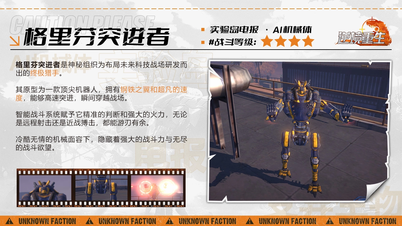 此次为大家呈上《逆境重生》AI机械体——格里芬突进者的图鉴。格里芬突进者作为神秘组织为谋划未来科技战场而研制的终极猎手,其原型是一款顶级机器人。它具备钢铁般的羽翼以及超乎寻常的速度,能够实现高速突进,眨眼间穿越战场。