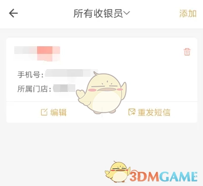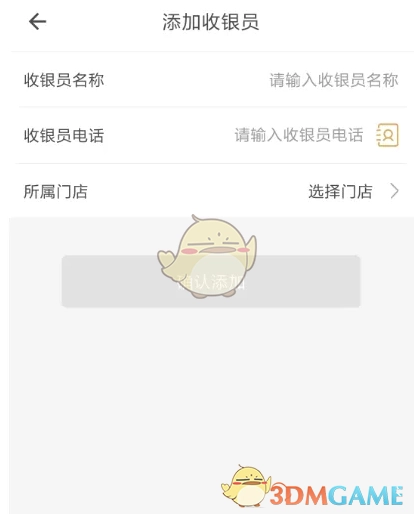 3、按照要求,填写收银员姓名、收银员联系电话,并选择收银员所属门店。填写完成后,点击“确认添加”按钮。