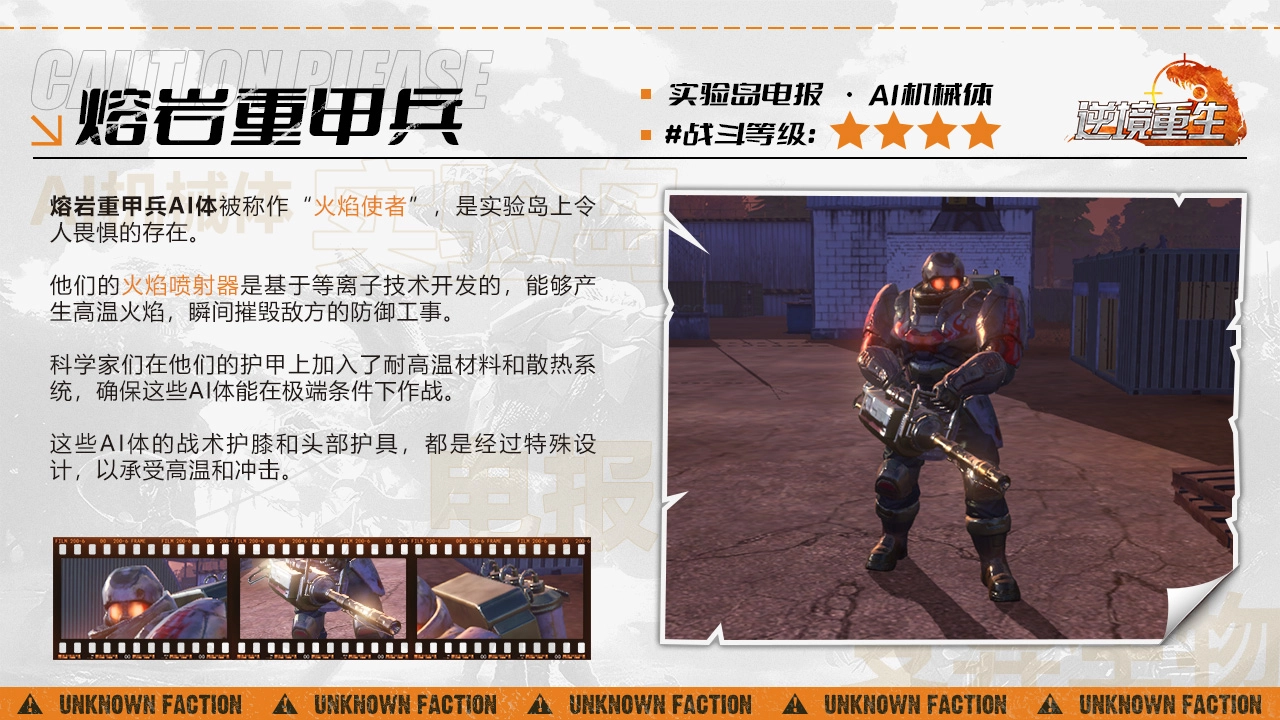此次为大家带来《逆境重生》中AI机械体——熔岩重甲兵的图鉴。熔岩重甲兵AI体素有“火焰使者”之称,是实验岛上令人胆寒的存在。其配备的火焰喷射器基于等离子技术研发,可喷射出高温火焰,能在瞬间将敌方防御工事摧毁。