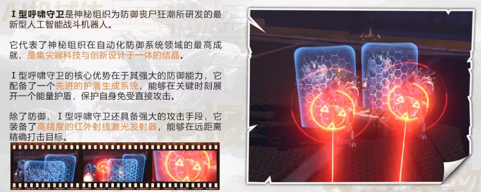 Ⅰ型呼啸守卫,是神秘组织为防范丧尸而研制的机器人。它象征着神秘组织在自动化领域的成果,配备了极为先进的护盾系统,关键时刻可开启能量护盾,使自身免受攻击。