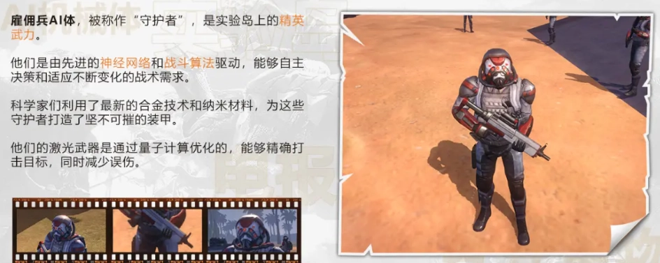 雇佣兵同样属于AI机械体,在实验岛上充当精英武力,靠神经网络与战斗算法驱动。实际上,它们能够顺应持续变化的战术需求。当下,这些雇佣兵配备了极为强悍的装甲,不仅能精准打击目标,还可降低误伤情况的发生。