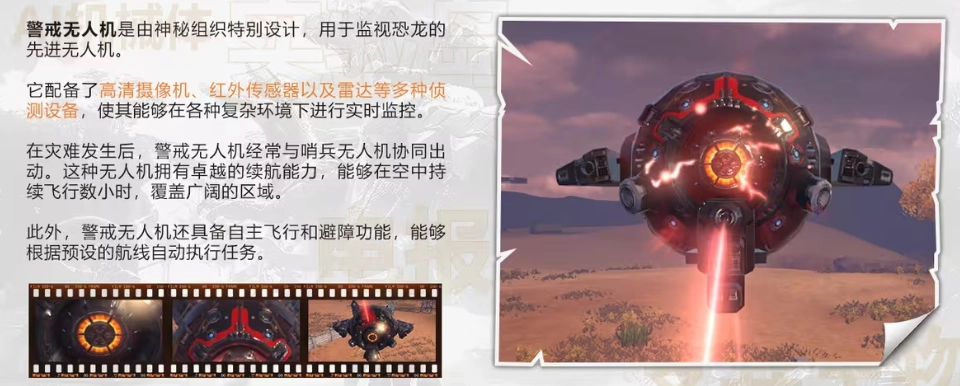 警戒无人机由神秘组织设计,其作用为监视恐龙。该无人机配备高清摄像机、红外传感器及雷达等多种侦察设备,可在各类复杂环境下执行监控任务。此外,它续航能力出色,覆盖区域极为广泛。