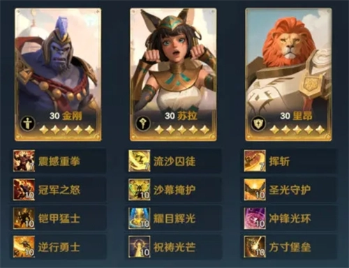这支队伍以金刚担任主C,在【冲锋光环】的影响下,能获取30%的伤害加成。而且金刚自身携带的技能【冠军之怒】,在受到伤害之际同样会实现伤害增加,要是携带嘲讽类技能,就能迅速将增伤叠满,使输出能力达到极致。里昂能够替队友分担伤害,保障金刚的存活。苏拉的自带技能【流沙囚徒】能够为队长赋予属性,搭配【耀目辉光】,还能为队友回复血量并清除负面效果。