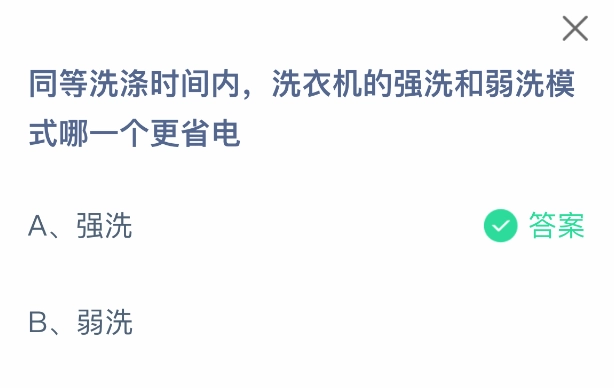 在同等洗涤时间的情况下,洗衣机的强洗和弱洗模式,究竟哪一个更省电呢?这正是支付宝蚂蚁庄园2025年3月8日的最新答案相关内容。若想获取更多精彩资讯,欢迎点击关注嘀哩嘀哩下载站,小编会持续为您更新!
