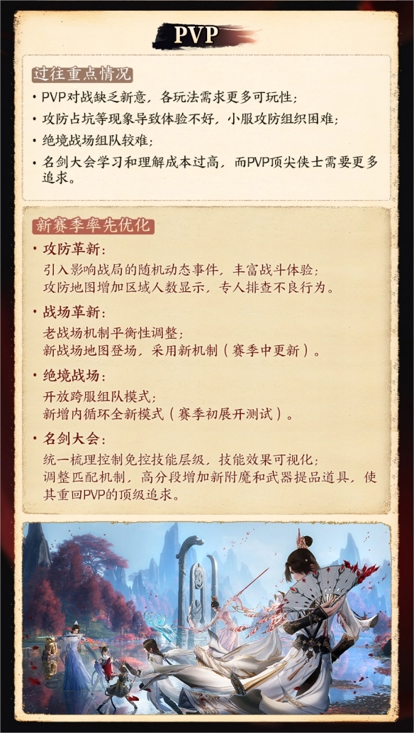 此前预告过的1V1门派内战插旗大王活动即将在3月下旬更新,后续的武林争霸赛也在准备之中。家园版本还将推出全新战场!若更多侠士愿意参与更具烈度的野外PVP,我们也会在后续版本中继续考虑优化。
