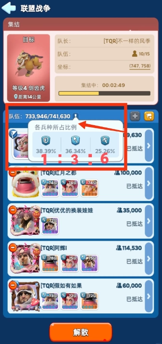 图中标记为1:3:6,是由于考虑到众多玩家存在弓兵数量不足的情况,无法使每个队列都达到127。所以,当弓兵短缺时,可考虑采用136或145这样的兵力比例。如此兵比例在打熊时能造成最高伤害。